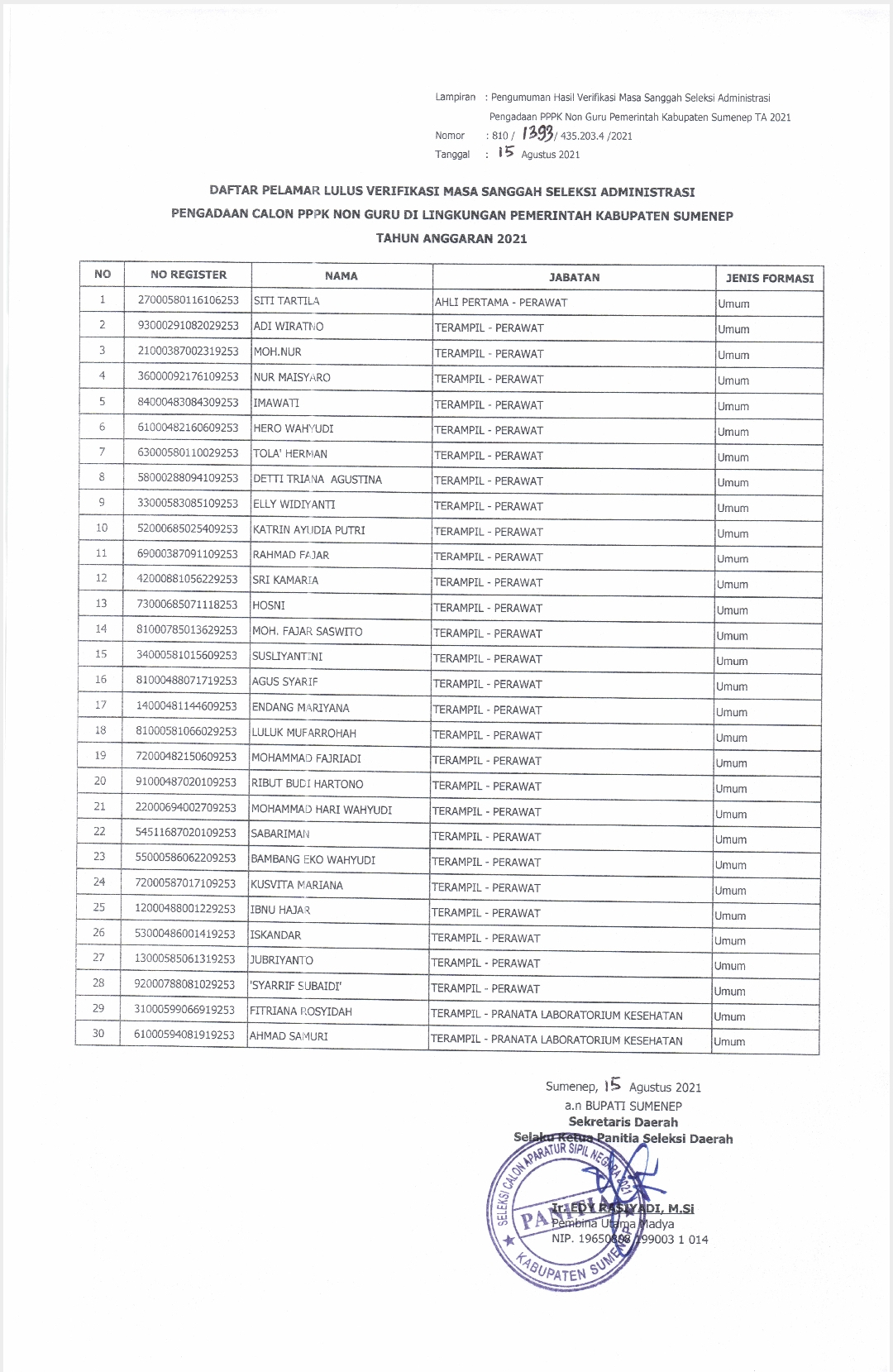 Hal ini sesuai dengan pengumuman Ketua Panitia Seleksi Pengadaan PPPK Non Guru di Lingkungan Pemerintah Kabupaten Sumenep Tahun 2021 Nomor : 810/1283/435.203.4/2021, tanggal 2 Agustus 2021, tentang Hasil Seleksi Administrasi Pengadaan PPPK Non Guru di Lingkungan Pemerintah Kabupaten Sumenep Tahun Anggaran 2021.