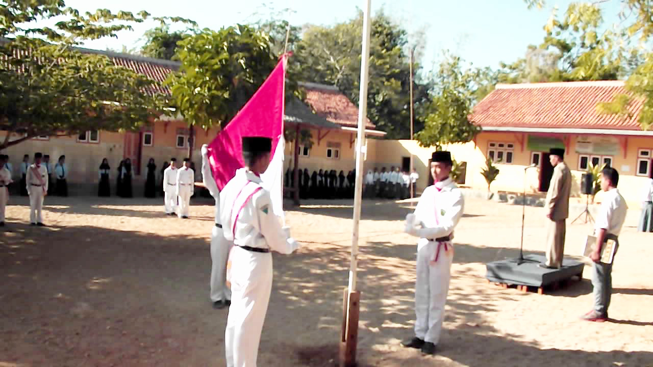 Para Santri Ponpes Zainur Ridla Nonggunong, Sapudi, Sumenep saat mengibarkan bendera merah putih di halaman sekolah. (Foto; Farouq for Mata Madura)