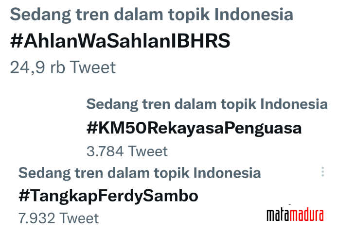 matamaduranews.com-Hastag #AhlanWaSahlanIBHRS, #KM50 dan #TangkapFerdySambo menggema di twitter sejak kemarin.