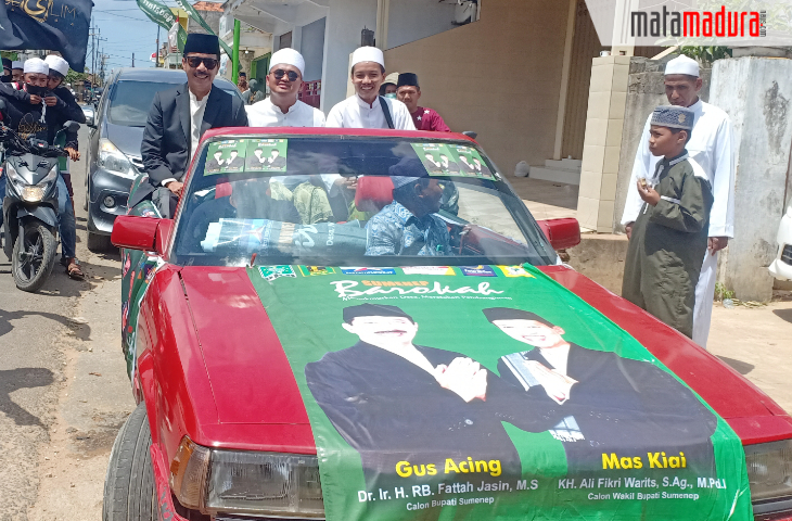 Bacabup Fattah Jasin dan Bacawabup KH Ali Fikri Warits saat diarak menuju Doa Bersama di Desa Laok Janjang, Arjasa, Kangean, Kamis (27/8/2020). Doa Bersama yang diadakan Kelompok Shalawat Nariyah Geslim untuk Pemenangan Fattah-Kiai Fikri di Pilkada Sumenep 2020. (matamadura)