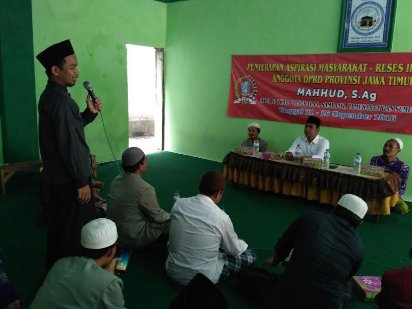 MataMaduraNews.com–BANGKALAN-Mahfudz, anggota Fraksi PDI-P DPRD Provinsi Jatim, menggelar serap aspirasi di Pondok Pesantren Nurul Cholil Demangan, Bangkalan, Senin, (21/11/2016). Mahfudz sengaja mengambil tempat reses di pesantren terbesan dan berpengaruh di Bangkalan ini, untuk mendengar keluh kesah para guru madrasah diniyah di Kabupaten Bangkalan.