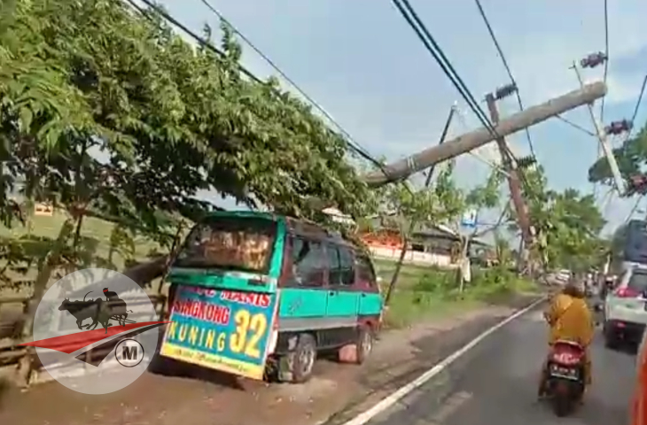 Tiang listrik yang roboh itu juga nyaris melintang ke badan jalan raya akses setempat. Pohon-pohon juga melintang hingga membuat jalanan macet hingga 16.49 WIB.